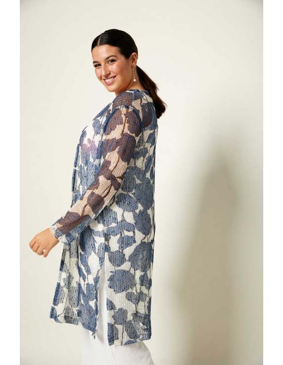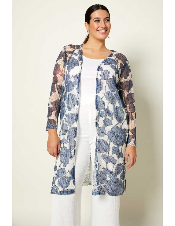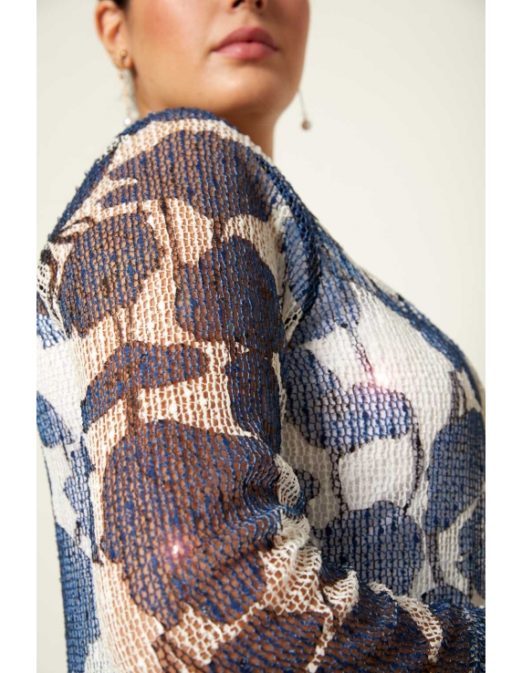 Chaqueta larga estampada tipo levita, en tejido de rejilla con pequeñas lentejuelas y aberturas laterales.
